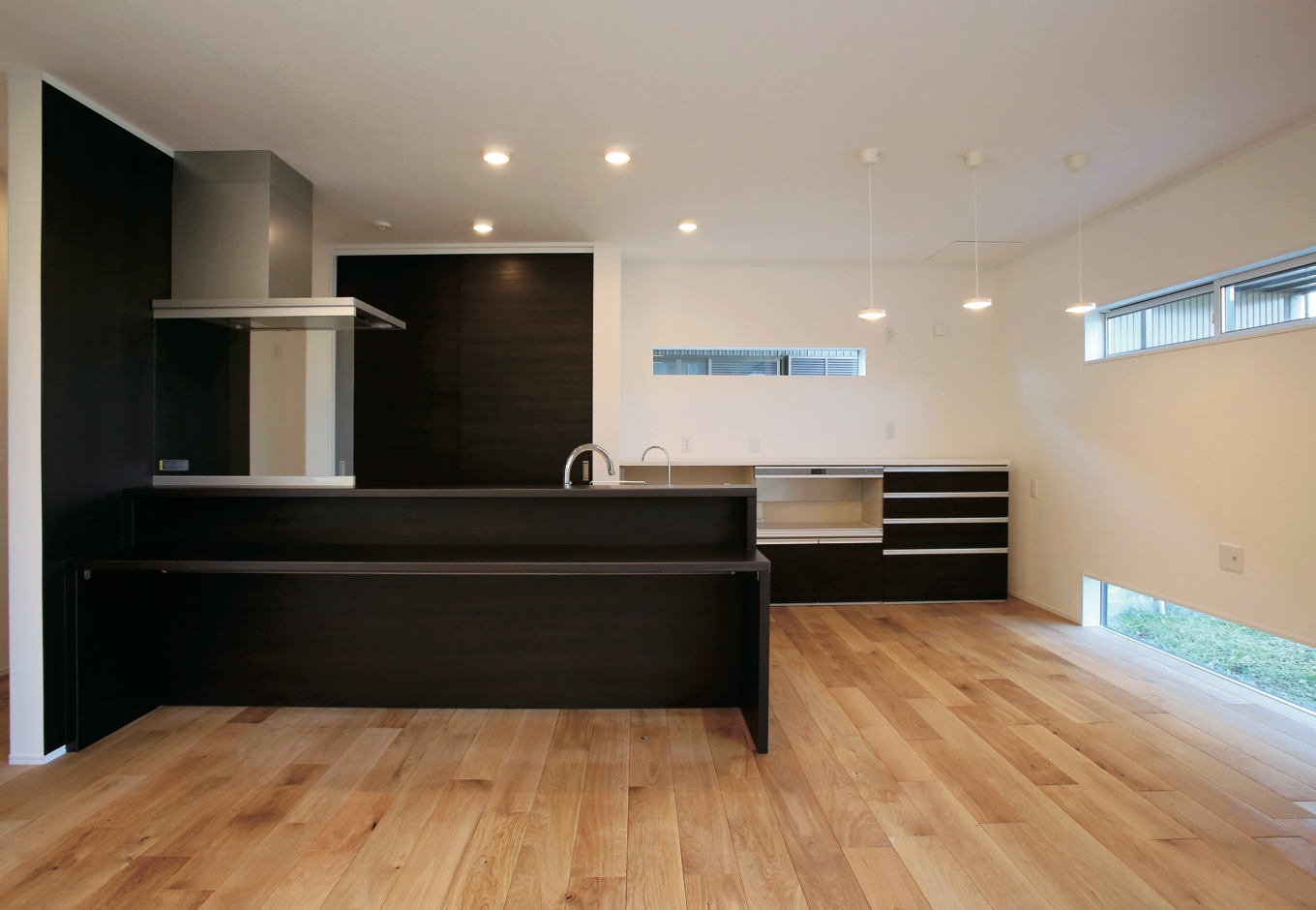 LDKは、白と木の空間に、キッチンはブラックで統一し、壁の上と下に横長の窓を配した【イエタテ】